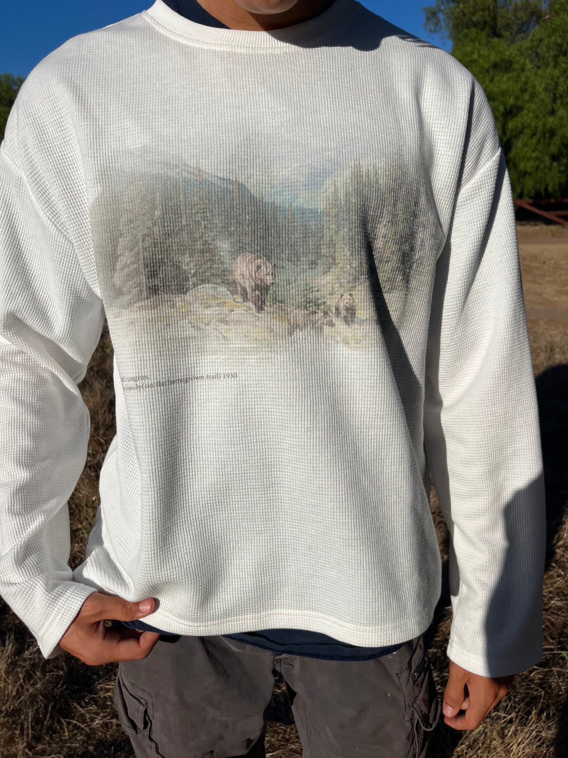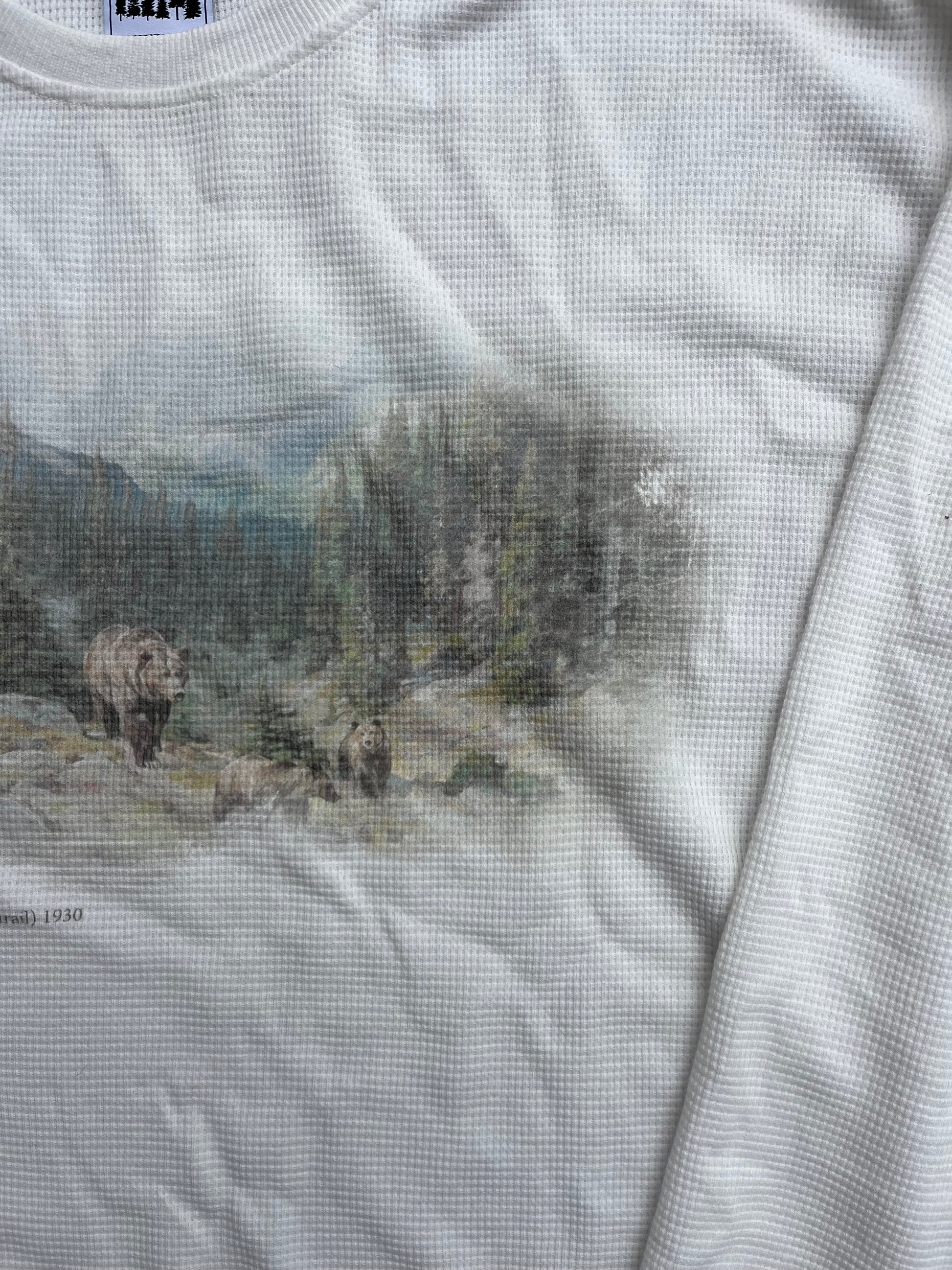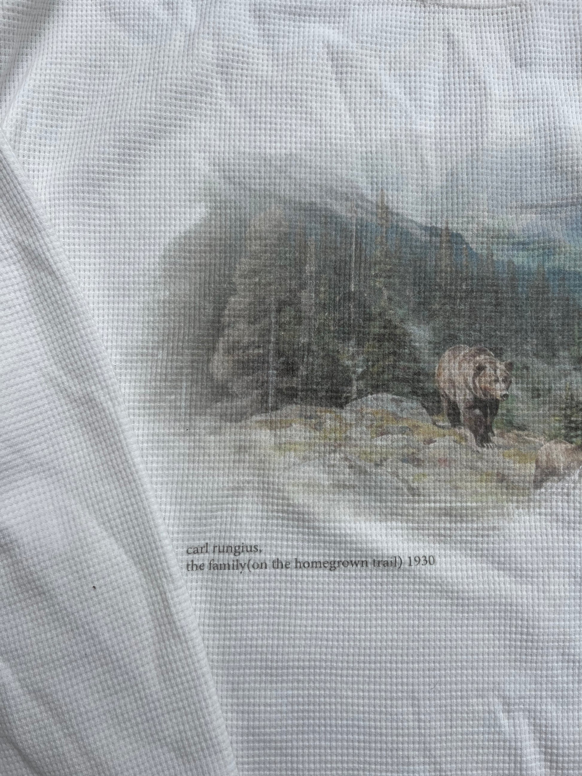 This thermal pulls from the paintings and illustrations of the American West of the 18th and early 19th centuries. It features The Family on the Homestead (1916) by Carl Rungius, one of the most celebrated painters of the American wilderness. His work captured the calm and allure of early homesteads and the vast stillness of the frontier.